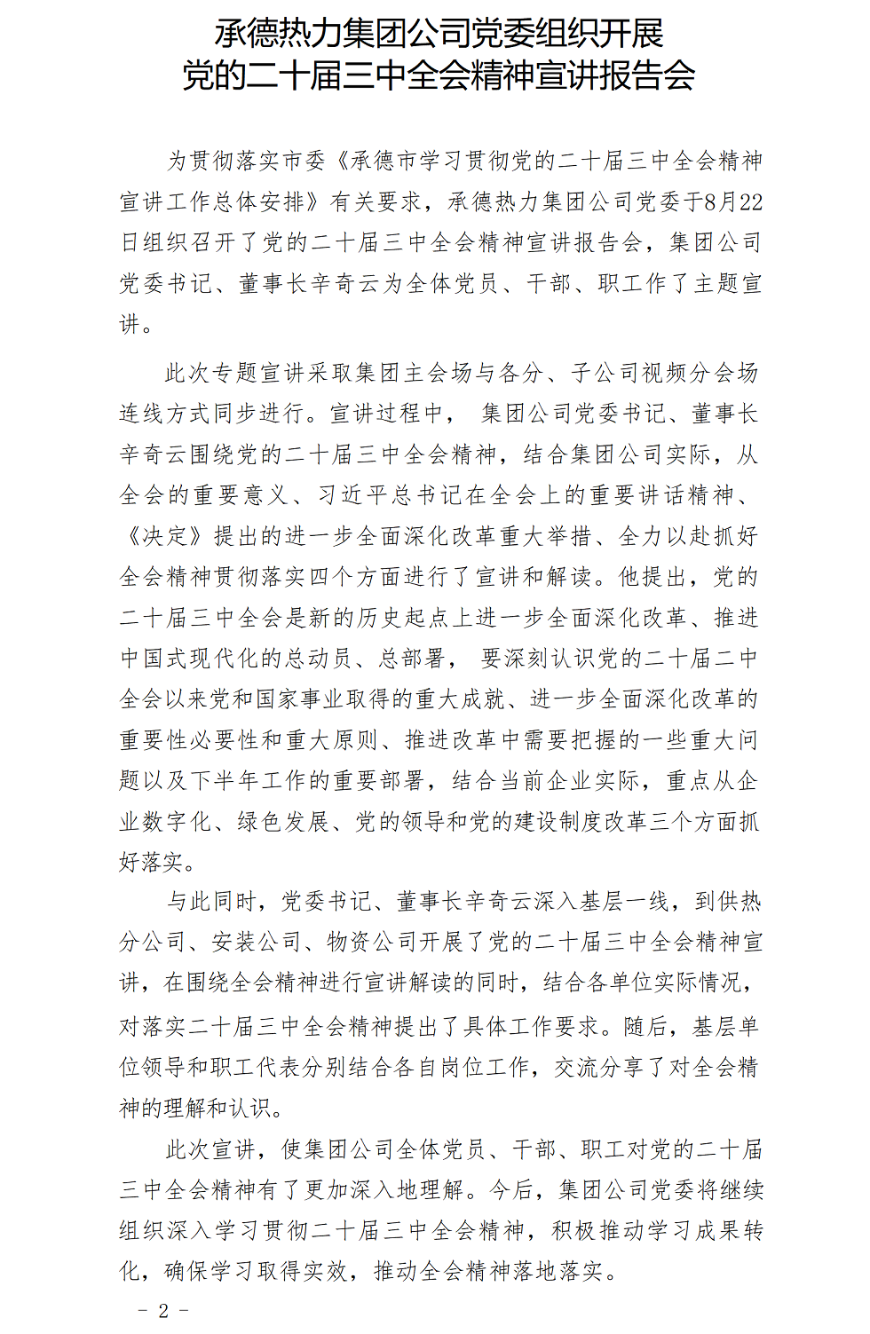 承德热力集团公司党委组织开展党的二十届三中全会精神宣讲报告会