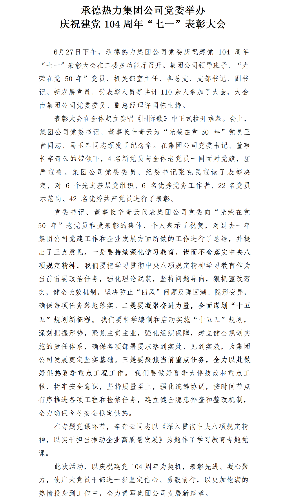 承德热力集团公司党委举办庆祝建党 104 周年“七一”表彰大会